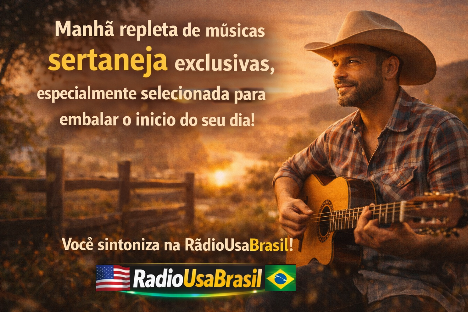 🚜 O despertar de quem faz a América acontecer! Das 06h à s 09h (ET), a Radio USA Brasil coloca o pé na estrada com você. Nosso Sertanejo traz o som da nossa terra com um toque único: músicas exclusivas que falam da labuta, da saudade da famÃlia e da vitória do brasileiro que acorda cedo nos Estados Unidos. É a trilha sonora oficial de quem tem garra e orgulho das suas raÃzes. Sintonize e comece o seu dia com a energia de quem nasceu para vencer! 🇧🇷🇺🇸